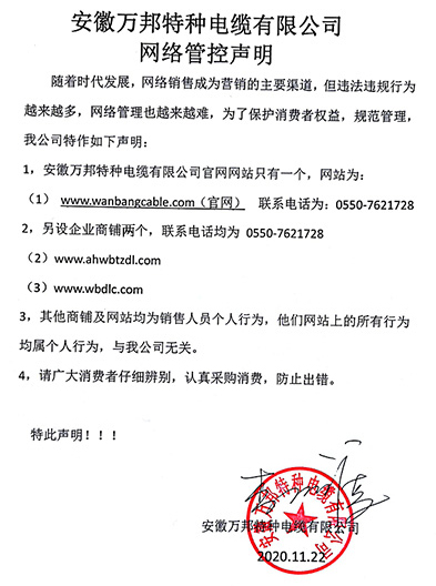 鄭重聲明:安徽萬邦特種電纜有限公司官方網(wǎng)站為:www_wanbangcable_com.qzhi365.cn,除此之外無任何子網(wǎng)站或合作網(wǎng)站,其余均為假冒偽劣。電話:0550-7621728 13485756353 地 址:安徽省天長市滁州高新技術產業(yè)開發(fā)區(qū)經(jīng)四路29號